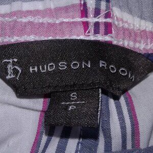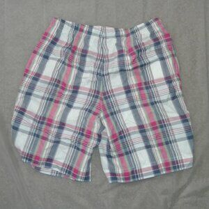used Hudson Room men's plaid shorts. Blue, pink, and white. Size small.
