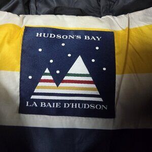 Hudson's Bay Coat Womens Small Black Long Puffer Hooded Down Striped Lightweight