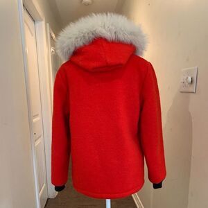 Hudson Bay hooded jacket in classic red wool with silver fox trimmed hood. Zippered front with snapped closure. Size medium, no size tags, see pics for measurements. Silver fox fur, not removeable, in excellent condition. Neck seam area has some staining, looks like makeup residue. We have not attempted to professionally clean this piece as it would need a fur specialist dry cleaner, not available to us, but suggests a spot hand cleaning might remove most of this stain. Exterior wool shows some typical signs of wear (see photos) but eminently wearable with no holes or tears detected. A piece of our vibrant Canadian history shown with pride from Lemon Squeezy Shop🍋