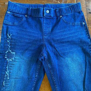 Distressed denim capri with cuffed ankles. Size small. Excellent Used Condition - worn only a couple times. Elastic waist. Heavier demin than most of the hue brand leggings.