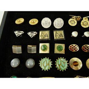 Elevate your style or expand your collection with this lot of 35 men’s cufflinks, featuring a mix of vintage classics and designer pieces. Spanning from the 1940s to present day, this collection includes some signed pieces with brands such as Swank, Hickok, Anson, Flex-let, Dante, Krementz, Sarah Coventry and La Mode.