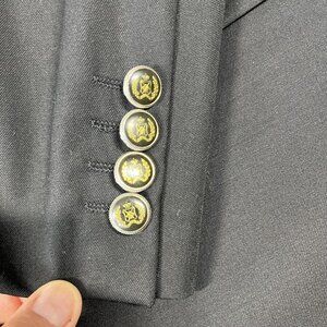 Features navy/black colorway with a smooth finish. Three-gold-tone crest buttons on the front and four matching buttons at each sleeve. Fully lined interior with multiple pockets, classic notch lapel, dual back vents.