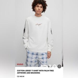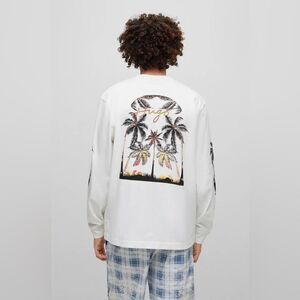 A long-sleeved T-shirt cut to a relaxed fit, detailed with handwritten branding and finished with palm-tree artwork by HUGO Menswear. By purchasing this product, you are contributing to protecting the environment and sustainable cotton farming in Africa. cmiA labeled products help to improve the living and working conditions of African cotton farmers and preserve nature.