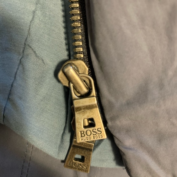 Blue BOSS Hugo Boss designer jacket with concealable hood. The jacket is in good quality and quite warm (though not a winter coat). It is high quality, made in Poland. Composition is: 50% cotton, 45% nylon, 5% polyamide. I have no use left for the jacket as the sleeves have grown short on me, but there is still a lot of life left in this luxury item.