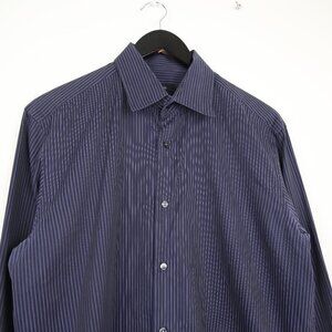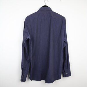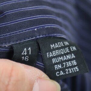 Button-down closure. Collared. Business casual style. Tailored back. Cuffed sleeves. 100% cotton. Made in Romania. In excellent, pre-loved condition with minimal signs of wear.