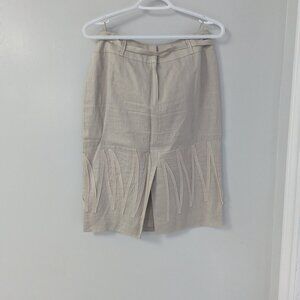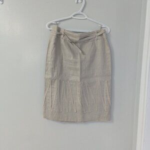 Hugo Boss women’s two-piece linen skirt suit in a neutral beige/light khaki. Features an asymmetric wrap-style jacket with textured detailing and 3/4 sleeves, paired with a pencil skirt with horizontal pleated accents. Great condition.