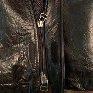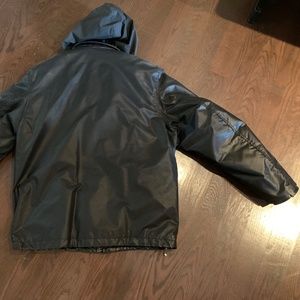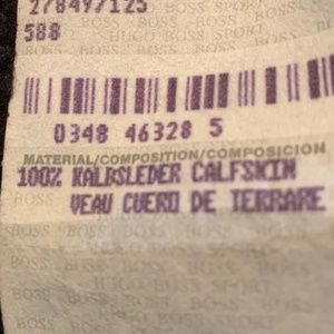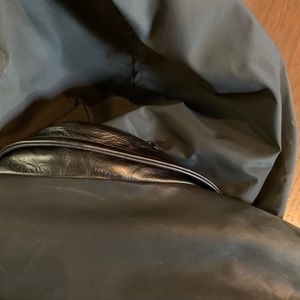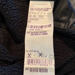 Very good condition Hugo Boss Fall jacket. Front panels and collar in real Calfskin leather. Back/sleeves/side trims in black nylon. Lining in 100% polyester polar fleece. Detachable hood. Beautiful jacket. Details as photos. Size 52, true to size from this brand. (Chest circf.: 51, back length from high point of shoulder 29"1/2 and across shoulder point to point is 20 1/2 inches.)
