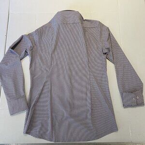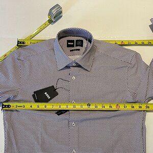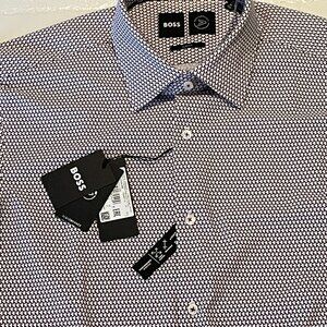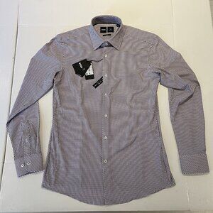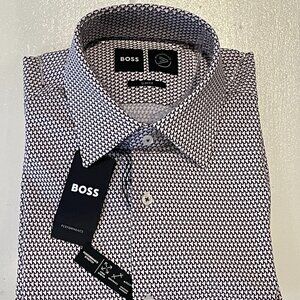 Men's Hugo Boss slim fit performance stretch dress shirt. Size 15.5/39 medium. Brown/burgundy/off white. Interior garment tag removed but included. Measurements in pics. NWT. Thanks.
