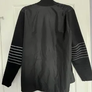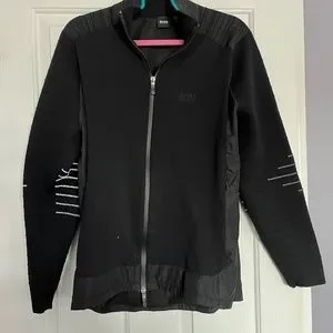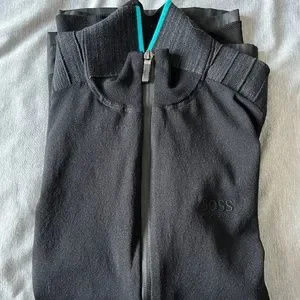 In good condition. Hugo boss Track Jacket in lightweight fabric with built in zipper side vents. Black with blue collar accents. Size XL