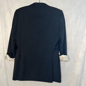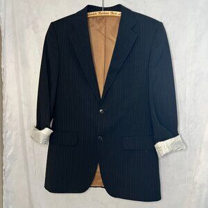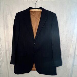 Beautiful virgin wool black blazer with copper pinstripes by Hugo Boss. Made in Turkey, exceptional quality and in great condition. Formal or business casual i.e. - as a suit blazer / wear with jeans for that quiet luxury look. I only have a female mannequin but it is a mens size, however, a great unisex piece.