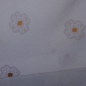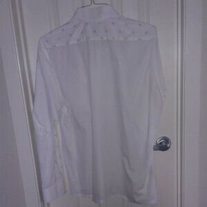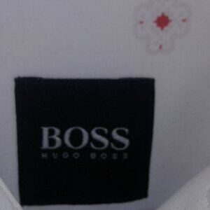 gently used Hugo Boss long sleeve, button down mens shirt. Flower pattern on shoulders and sleeves. Orange and grey on white background.