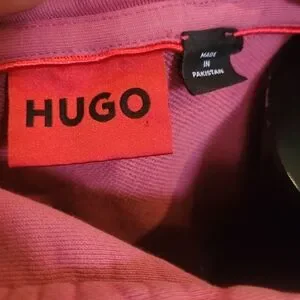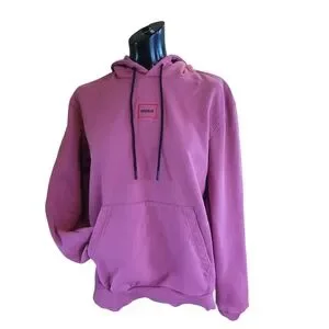 Stylish pink hoodie with front pocket and drawstring hood. Features Hugo logo on the chest.