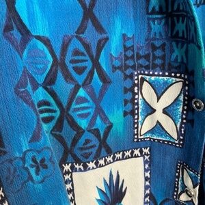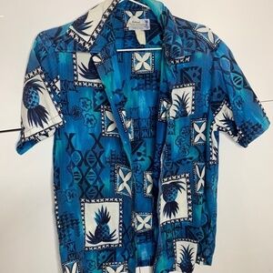 Hukilau Fashions Retro Vintage 70s Hawaiian Shirt ~ Size Small Blue Palm Floral