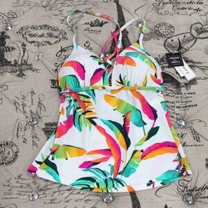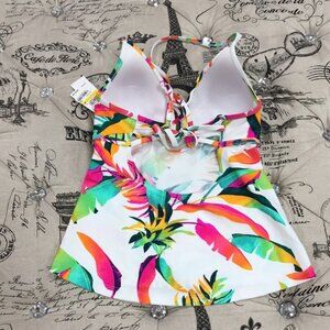 Brilliant pastels bring vibrance to this tankini top from Hula Honey, a fresh look with strappy accents at the front and back.