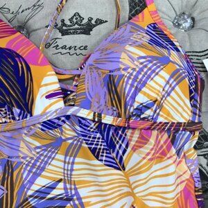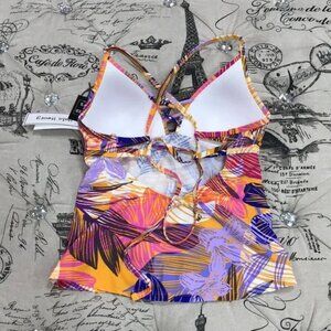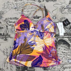Stylishly strappy at the front and back, this tankini top from Hula Honey features a vibrant tropical print and adjustable straps to take the look to the next level.
