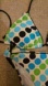 Stylish bikini set with vibrant polka dots. Features blue, green, and black dots on a white background. Perfect for a fun day at the beach.