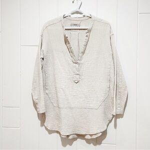 An oversized, loose-fitting double weight gauze blouse with a deep henley neckline and wide placket in the front. The blouse has a dropped shoulder seam and long sleeves that can be rolled up. The front of the blouse features a stitched detail with pockets. The bottom features a rounded hemline. The back features a stitched self fabric patch and an inverted pleat.