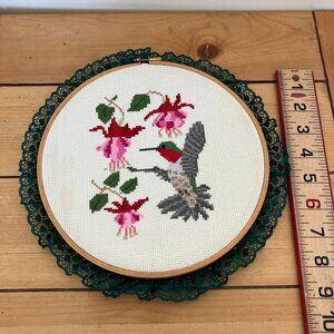 Completed hummingbird cross stitch embroidery is framed with a wooden embroidery hoop. Frame has white fabric hot-glued to back with dark green lace around the edge. 10" across including lace trim (8 1/2" not including trim). Pre-owned completed cross stitch embroidery: white fabric has a few discolorations (see close-up photo).