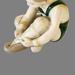 Two porcelain figures of about 4 1/2 inches tall of two children wearing a green and red shorts tying their shoes in a sitting position .