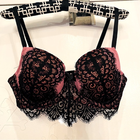Gorgeous pink and black lace bra from Hunkemoller in Amsterdam. Size is 34D and fits true to size. This is a luxe lingerie line in Europe similar to Victoria’s Secret.