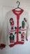 Festive red and white button up holiday / Christmas sweater depicting four different Santas.