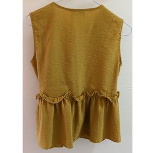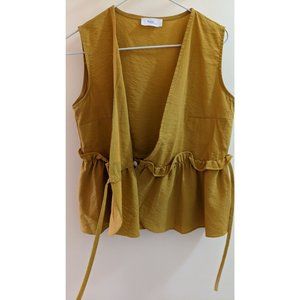Hunt by Runway Bandits - Wrap tank top with button and tie closure. There is also a ruffle detail below the chest and the wrap creates a flattering V-neck silhouette. Great with jeans or shorts. The color is mustard.