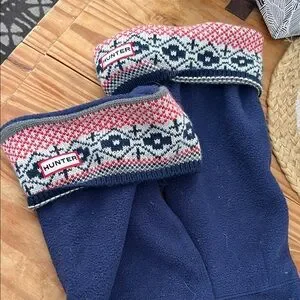 Cozy boot socks with intricate red and blue design. Ideal for warmth and style. For Tall Hunter boots