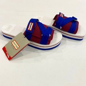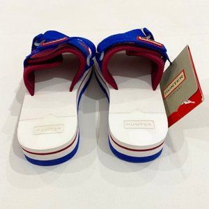 Regular fit.** With a chunky sole, the lightweight Women's Flatform Beach slide has a raised footbed and EVA striped outsole to provide comfort in every step. The decorative adjustable strap zig-zags over the foot to offer a supportive, customisable fit. These claret and blue slide sandals are crafted with breathable padded mesh backings for added ventilation.