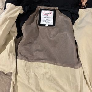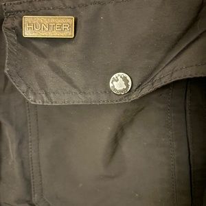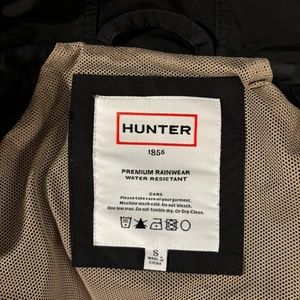 Hunter, size small, black, hooded rain coat. One button has noticeable wear, and a few more have a few rub marks. Otherwise, in great condition.