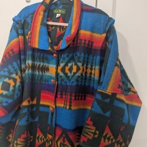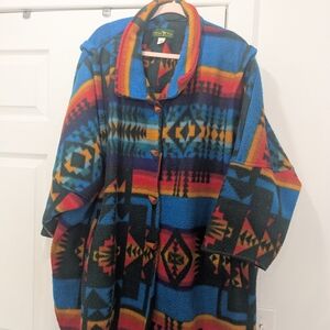 Stylish coat with a blend of vibrant colors. wooden toggle buttons. Features a cozy fleece texture. generous sizing, size 1x