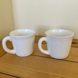 Set of 2 Vintage made in USA ceramic mugs have two different hunting dog designs on the front. One shows a pointer dog and the other shows a golden retriever with a duck. Bottoms are embossed "USA". Ceramic mugs are approx. 3" tall x 3 1/2" across top rim (not including handle) and hold up to 8oz. Pre-owned vintage condition: rims had gold edging and have a few spots left of gold coloring (most is worn-away). Glaze has crazing from age. Bottom surface shows wear from use.