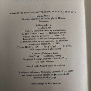 Hurban: Responses to Catastrophe in Hebrew Literature Hardcover by Alan Mintz