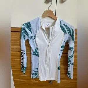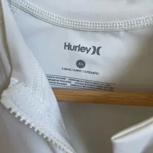 Sleek white rash guard by Hurley. Features a front zipper and durable stitching.