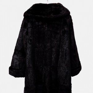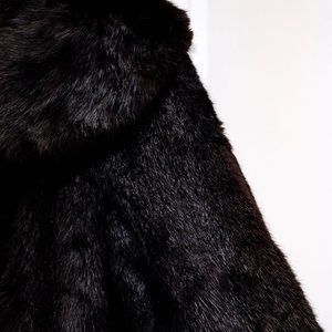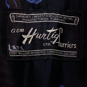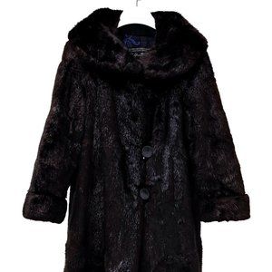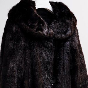 A luxurious beaver car coat from Canadian furrier Hurtig crafted with black beaver pelt that displays unique dark brown-undertones when caught in the light. This coat has a round neckline and lapels, two side slip pockets, three large circular buttons down the front, cuffed sleeves, and midnight blue interior lining embroidered with lilies and containing a slip pocket over the chest.