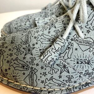 Hush Puppies blue Cyra Caitlin Chukka boots. 100% suede. Blue laces with tassels. Rubber Sole. Approx. 1" heel. Approx. 4" shaft height from arch. Removable footbed insert that adds a bit of lift (approx. 1"). Some very minor signs of wear (e.g. small mark where tag was removed on inner footbed). Excellent pre-loved condition. A comfortable and unique addition to your wardrobe!
