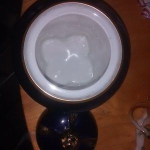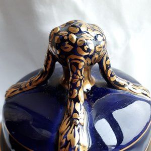 Designed by Hochschule-trained Fritz Klee, this beautiful and undamaged 1920's era lidded jar is usually found in gold and white, but this one is in the rare cobalt blue with heavy gold trim and mythical animal friezes on the base. Triple-marked on the base with Hutschenreuther lion, Abteilung fur Kunst (Art Department) and Klee's signature indicating he is head of the art dept. Very rare, very lovely. A nice collector's addition.
