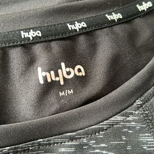 Hyba black, gray and blue activewear top. Back has a mesh oval panel. One small pull in blue side, see pic. Otherwise very good condition.