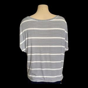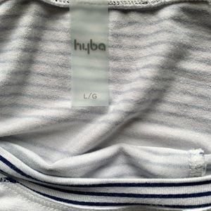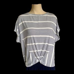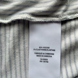 Non-clinging material IMO colours are navy and white stripes with the pre made twist in front