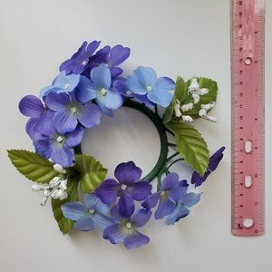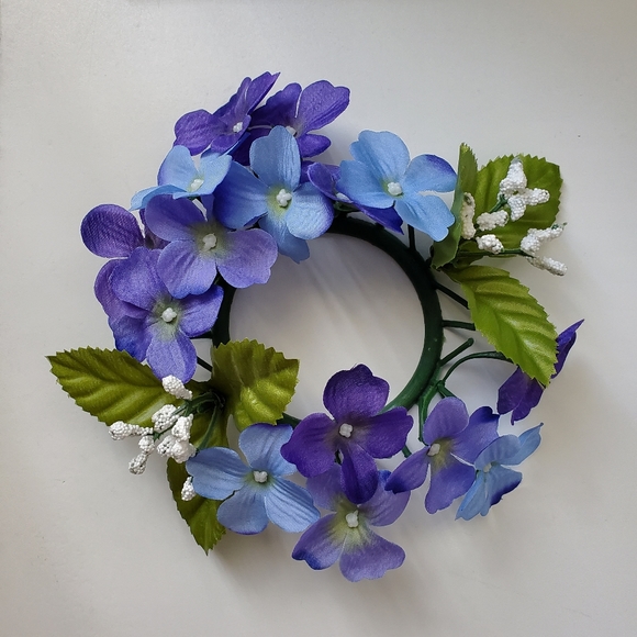 Good to excellent condition. Mini wreath featuring blue and purple faux fake plant hydrangeas. Measures about 15 cm by 15cm including the flowers