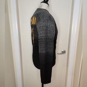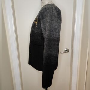 Ombre Black to Charcoal Grey Soft Felted Wool Knit Crewneck Buttonup Cardigan Sweater Jacket with Yellow Embroidery and front Welt Pockets, by Japanese Brand Hysteric Glamour.