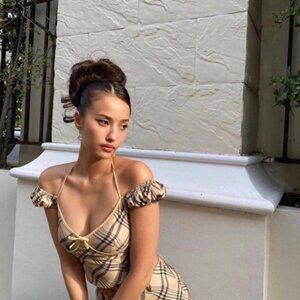 ★ Neutral check puff sleeve top. Custom GIA check print. Halter neck strap detail. Wide neckline. Matching binding around bust with decorative bow