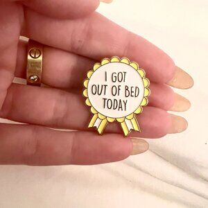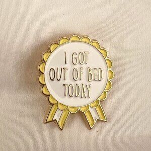 An awesome enamel pin, featuring a ribbon with the caption "I GOT OUT OF BED TODAY." For days when you just aren't feeling the whole life stuff. Gold backing.