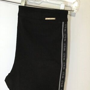 Comfortable and stylish, black skinny, pull-on pants. Feature a logoed tuxedo stripe along outer leg and along split, high/low hem.