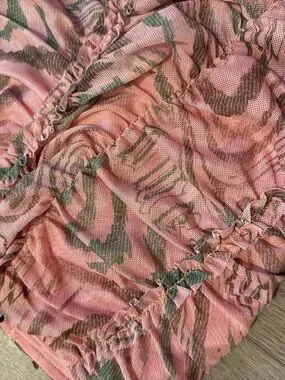 Fitted mini with gathered ruched panels. Pink animal-print mesh overlay. Stretchy fabric for a snug silhouette. Sexy, eye-catching detail for night or day.