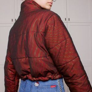 - Gorgeous deep red big buffer bomber style coat featuring silver (zipper) detailing, drawstrings at the bottom/cuffs & a very flattering cut by I am Gia. Please refer to the last picture for the best coloring of the item, it has a gorgeous color-changing hue (deep blood red/grey silver). Retails originally for $200 + taxes ‼️ Sold out on Dollskill / Urban Outfitters.