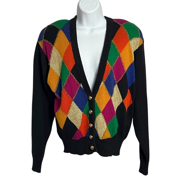 I.B. DIFFUSION Vintage Sweater Sz S Argyle Colourful Gold Thread Bright 90s