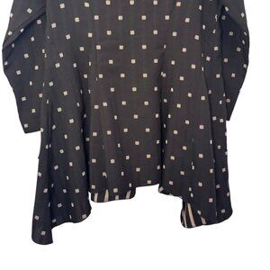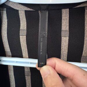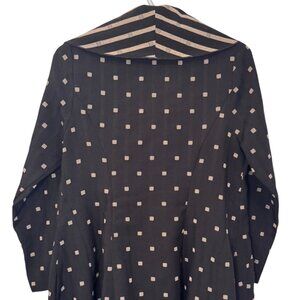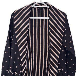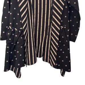 an IC by Connie K open-front cardigan jacket. The jacket is black with a contrasting tan pattern. The body and sleeves feature a pattern of small squares, while the inner lining and lapels have stripes pattern. It has an open-front design side pockets. The style is described as artsy, boho, lagenlook, and retro modern.