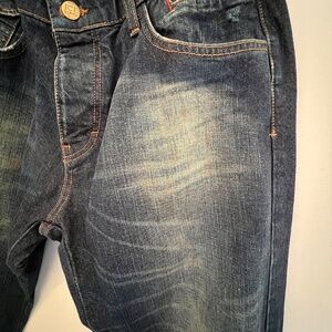 The jeans are faded, with intentional stains/rips throughout, whiskers and distressing