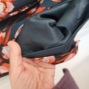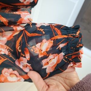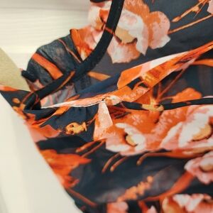 Elegant floral blouse featuring vibrant orange flowers on a blue background. Attached tank top. Perfect for any occasion.