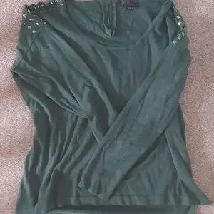 Lightly worn green sweater with rhinestone shoulder detailing. Casual and comfy.